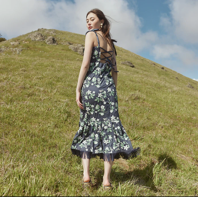 This midi dress embodies garden goddess. Satin ribbon corset details at the back provide a beautiful juxtaposition to the fun fringe that dances on the hem. Allover multicolored floral embroidery makes this piece eye-catching and special. It is finished with velvet ties at the shoulder for that romantic touch - 100% Cotton Poplin - Allover embroidery - Made in India - Dry clean onlyShare