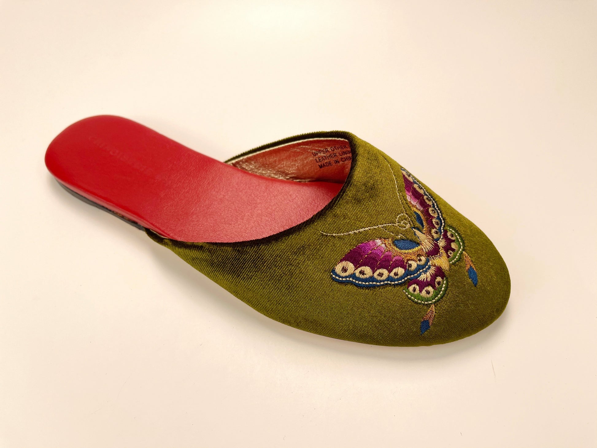 A refined details of ancient butterfly design that it gives your outfit a touch of personality and femininity. Almond toe with padded soles for adding comfort. They are crafted from butter-soft leather lining and insole. Outsole is leather in soft brushed handfeel. Narrow fit with low heel for extra elegance. You can pair with your favorite jeans for a stroll on Sunday farmer's market, or make yourself comfy with our mules for a perfect flight outfit and just as charming for a special night out.