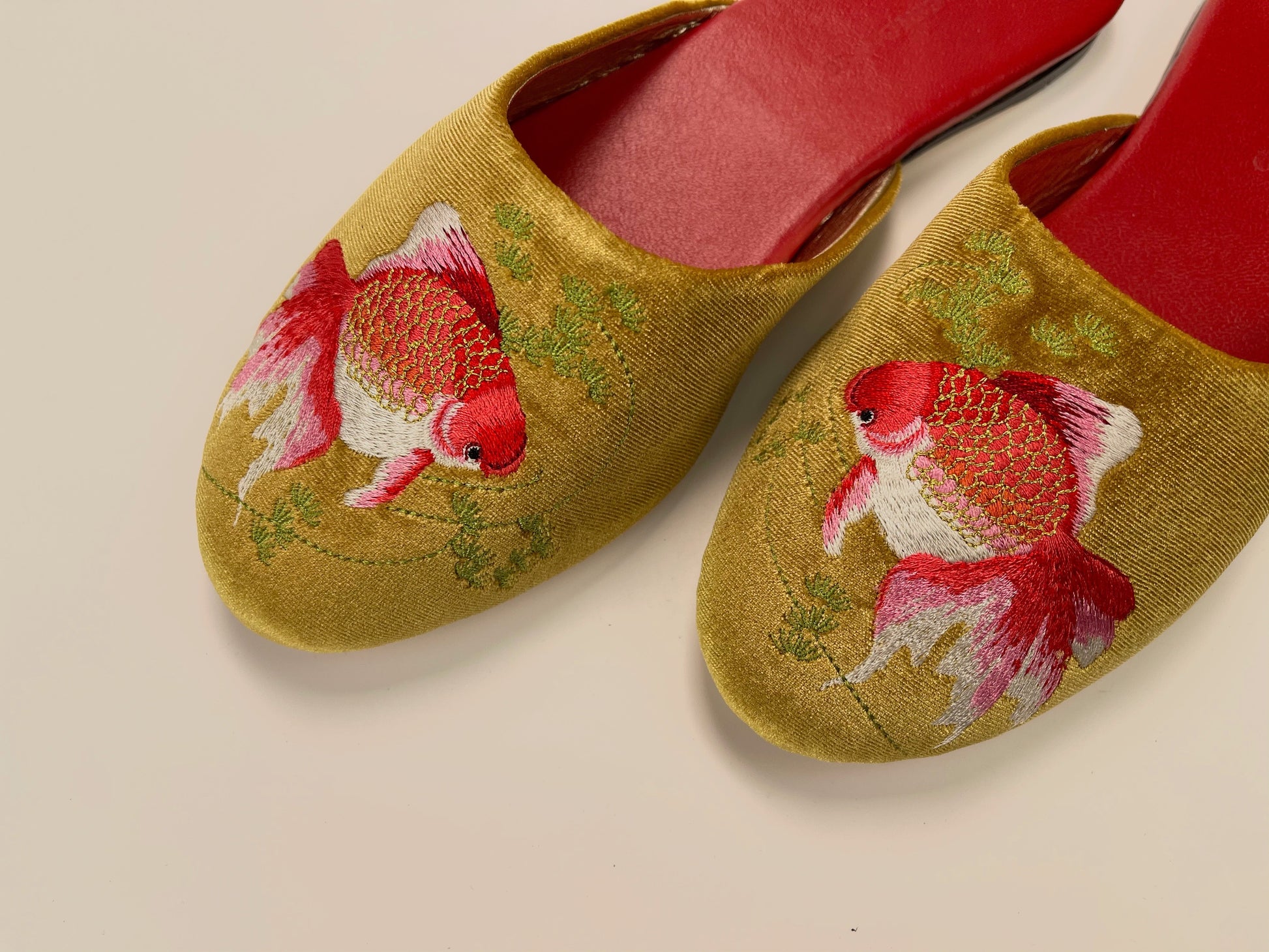 It is exotic whilst playful design with embroidery of Goldfish adding your look as eclectic as you want to be. Trust me, you will never look boring! Almond toe with padded soles for adding comfort. They are crafted from butter-soft leather lining and insole. Outsole is leather in soft brushed handfeel. Narrow fit with low heel for extra elegance. You can pair with your favorite jeans for a stroll on Sunday farmer's market, or make yourself comfy with our mules for a perfect flight outfit and just as charming for a special night out.