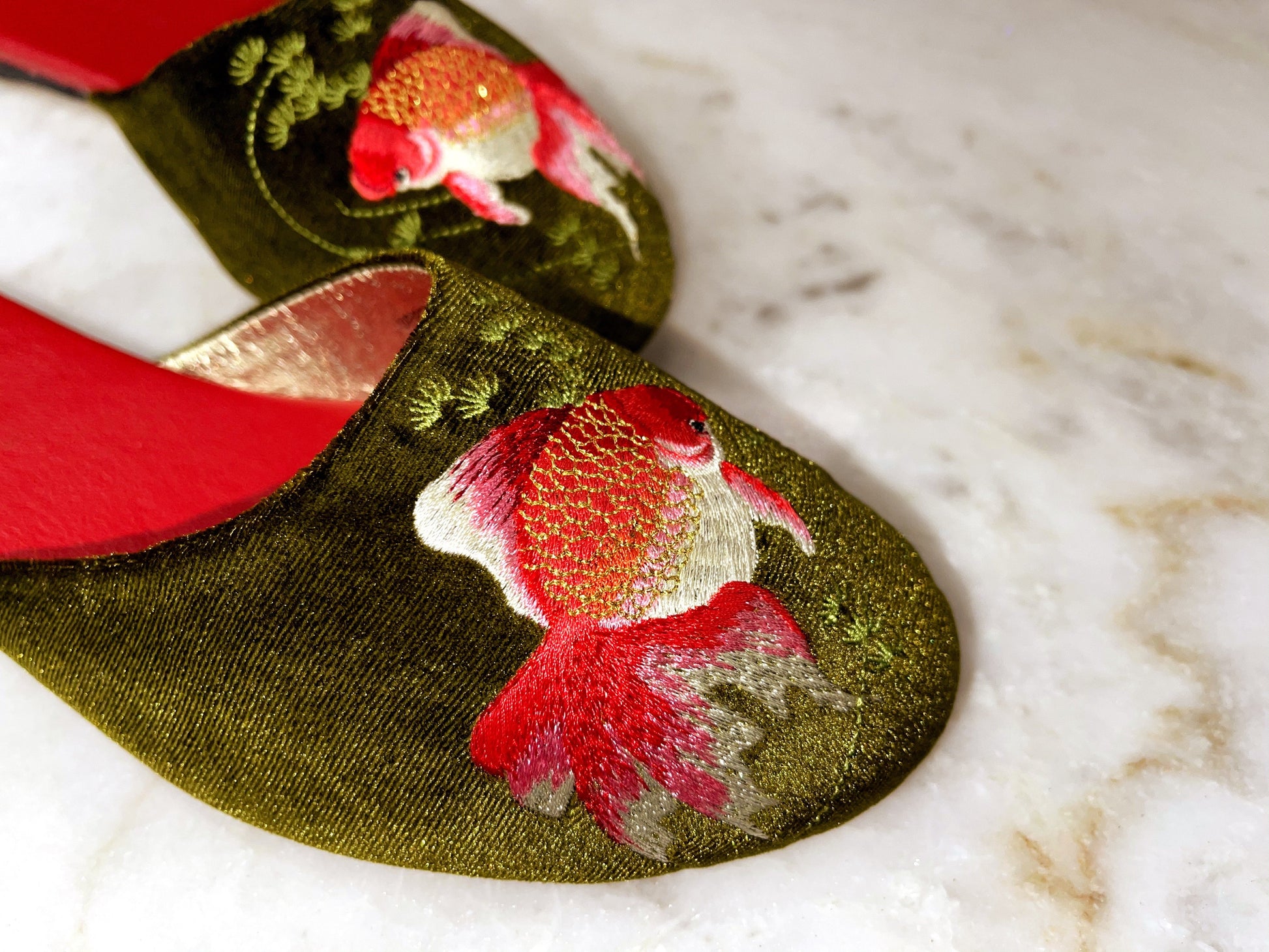 It is exotic whilst playful design with embroidery of Goldfish adding your look as eclectic as you want to be. Trust me, you will never look boring! Almond toe with padded soles for adding comfort. They are crafted from butter-soft leather lining and insole. Outsole is leather in soft brushed handfeel. Narrow fit with low heel for extra elegance. You can pair with your favorite jeans for a stroll on Sunday farmer's market, or make yourself comfy with our mules for a perfect flight outfit and just as charming for a special night out.