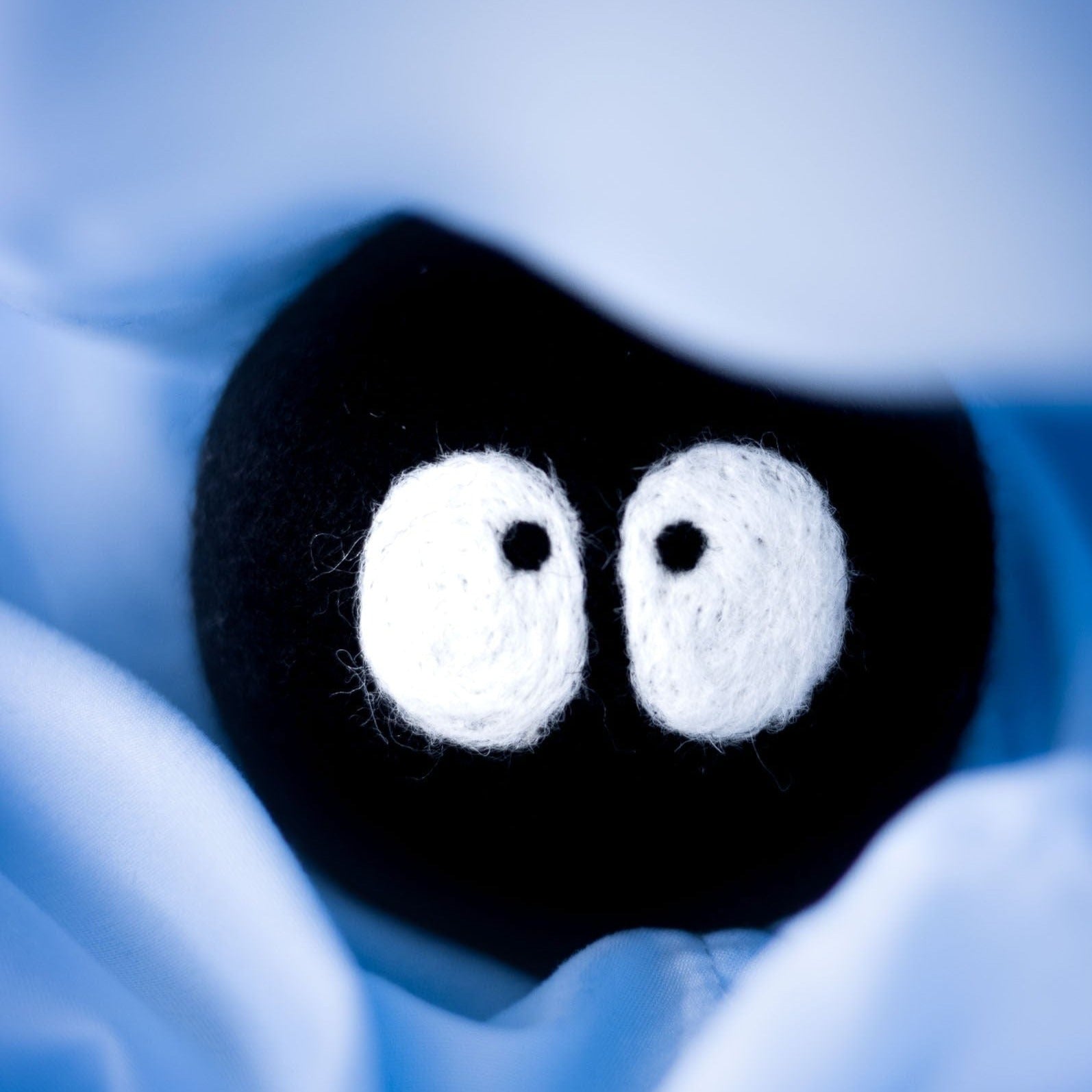 Set of 3 soot black dryer balls with white googly eyes. They come in a reusable black and white handmade cotton storage bag. Our sets of 3 are perfect for small and medium loads, can be doubled for larger loads. This set comes with a handy user manual inside the bag.