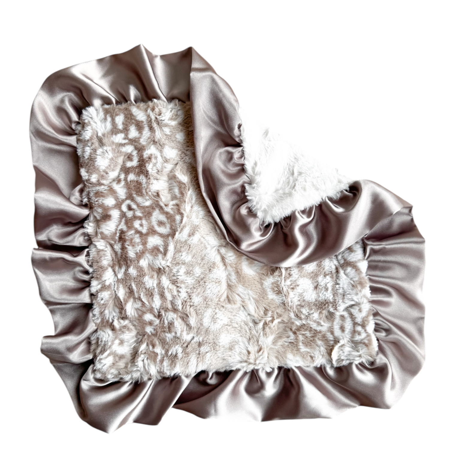 Let your little one snuggle in style with our Lovely Leopard Luxury Lovie. This 15" by 15" miniature blanket features a chic ocelot print in soft ivory and tan tones, trimmed with a feminine ruffled satin edge for a sweet and stylish finish.