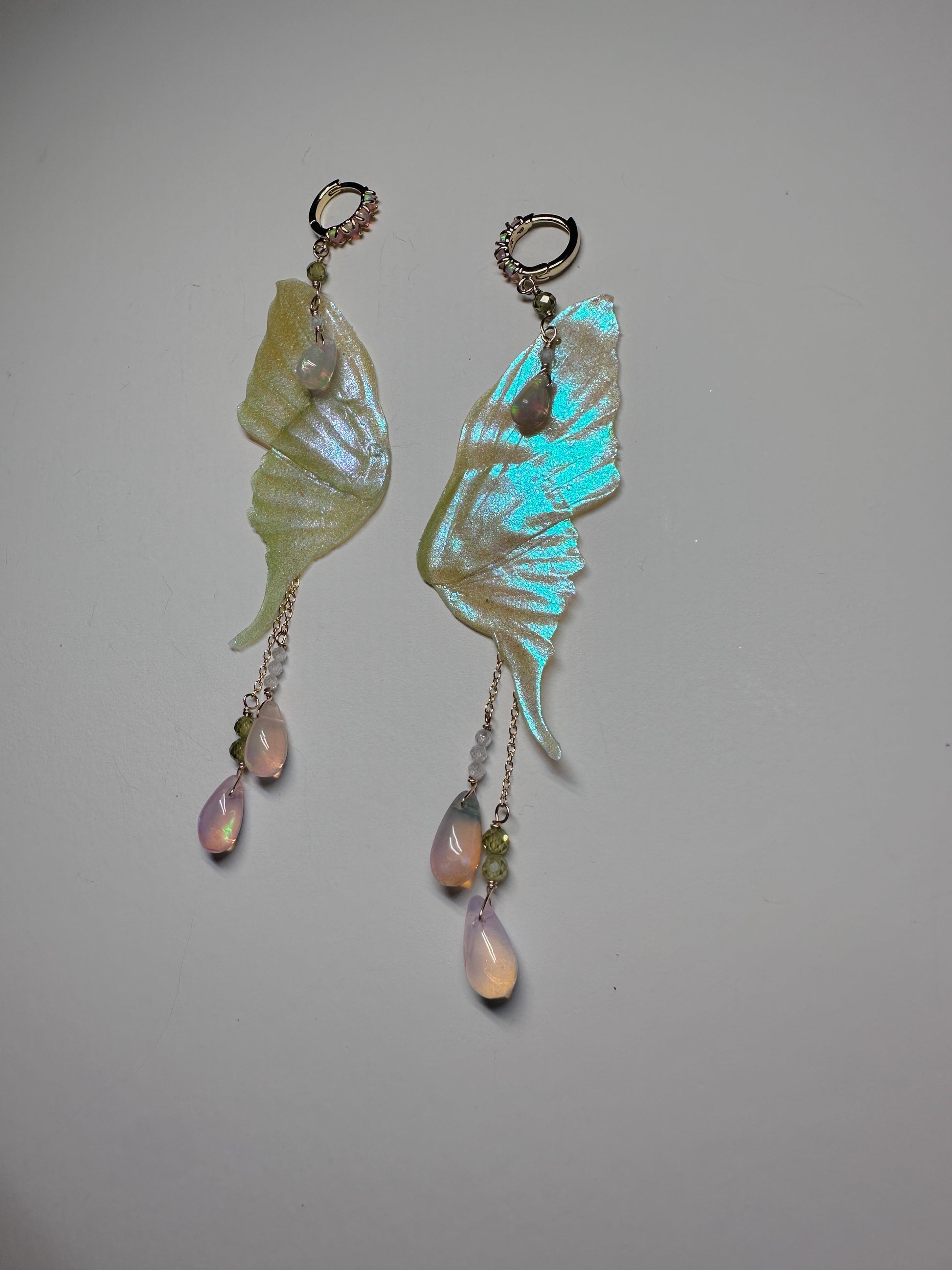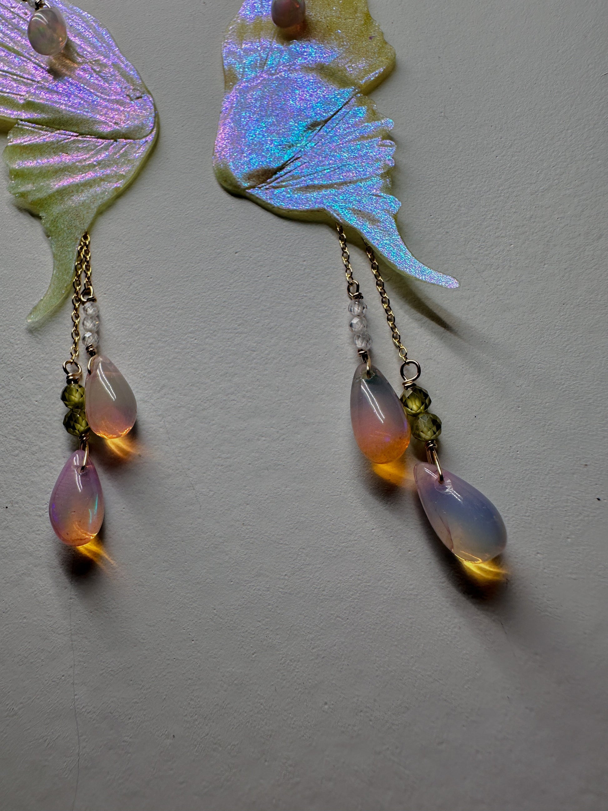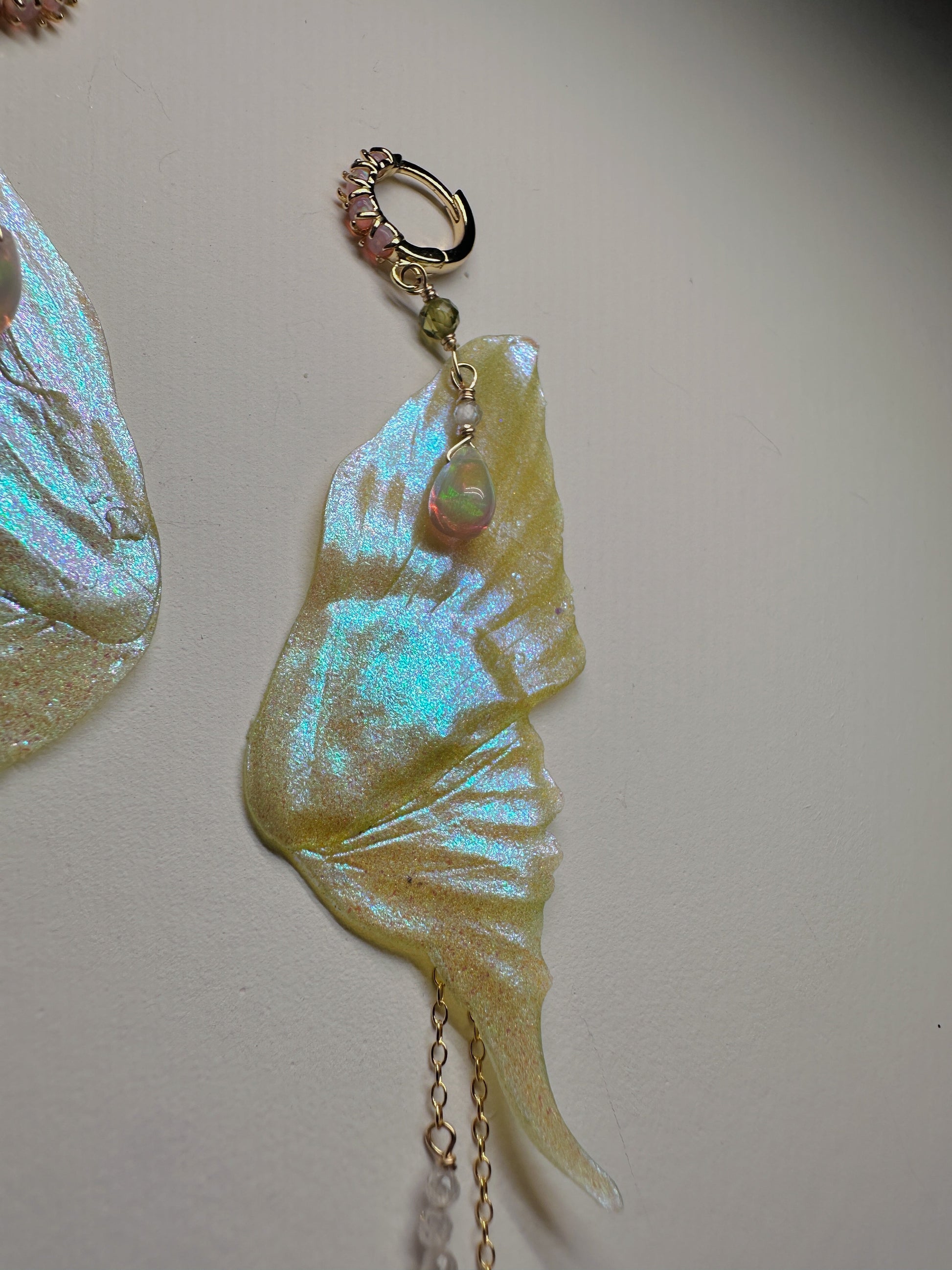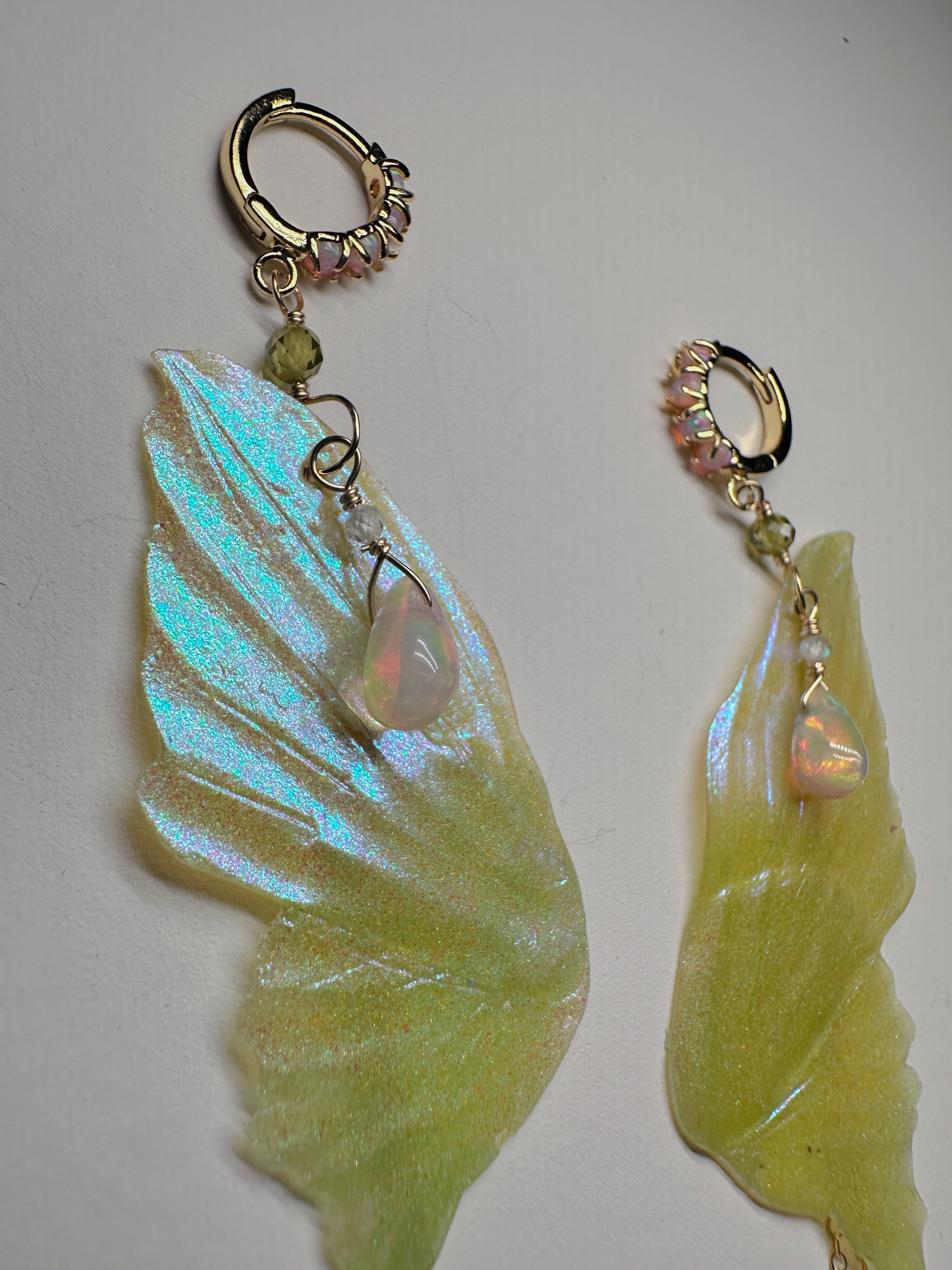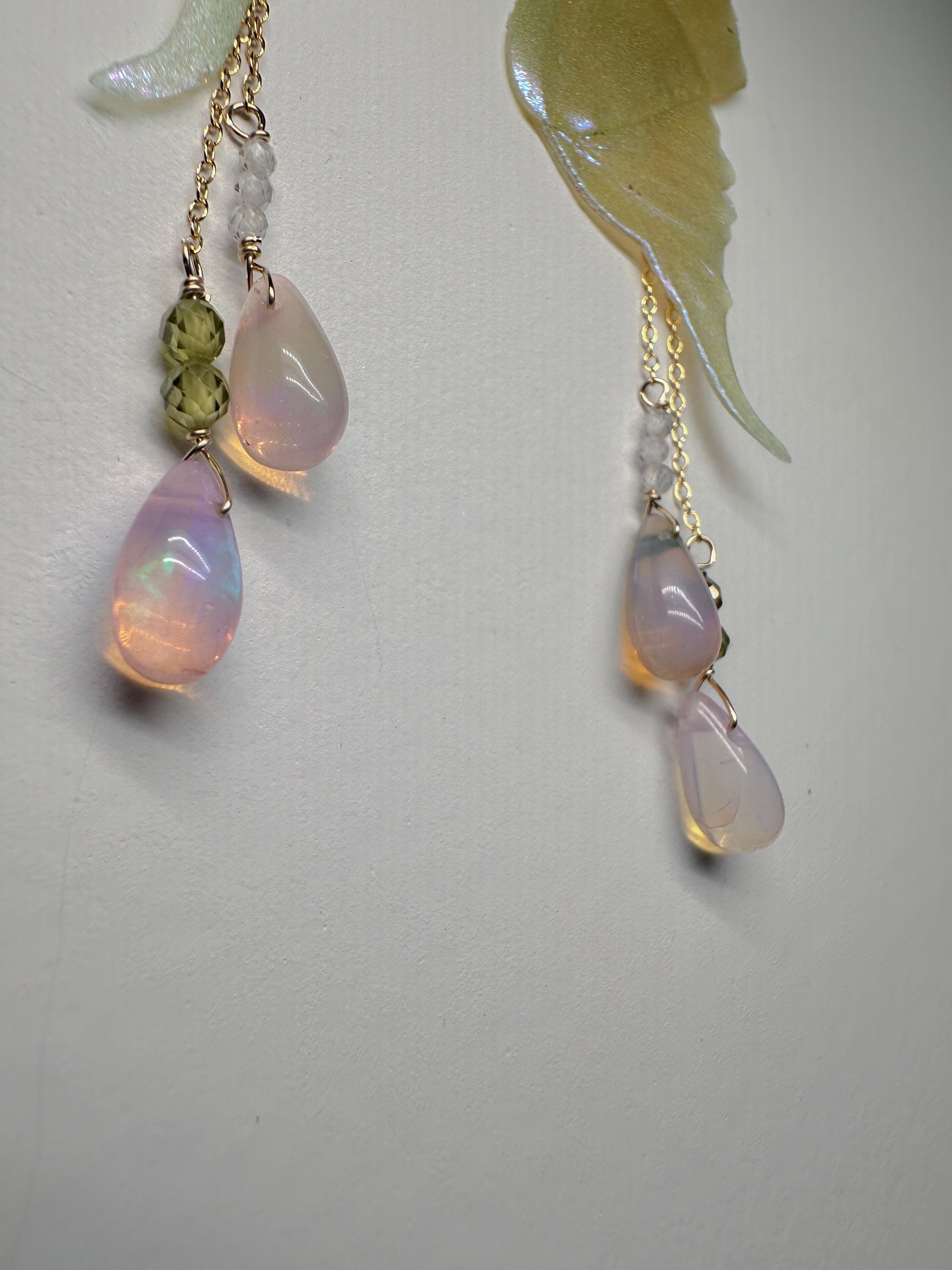 delicate lavender Ethiopian opals dance beneath soft meadow green fairy wings, creating an effortlessly enchanting look perfect for everyday magic on brass pink opal huggies