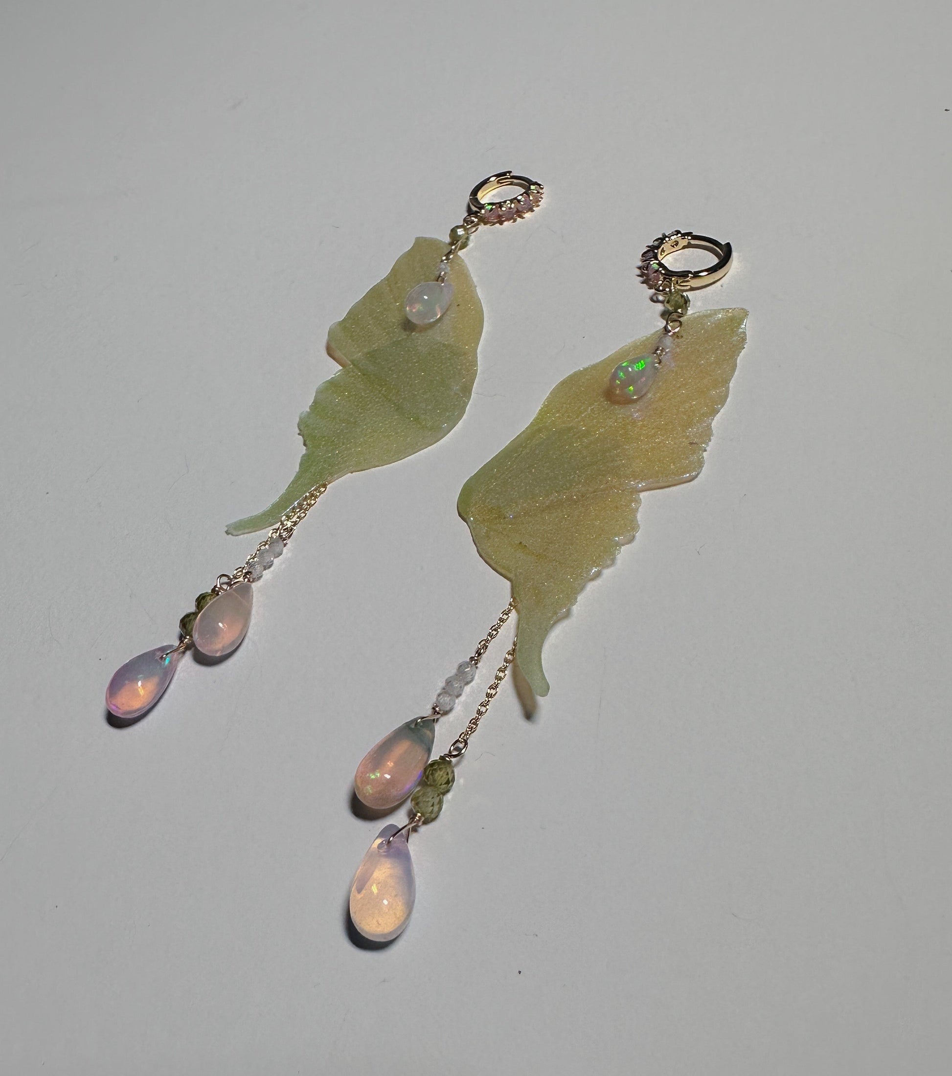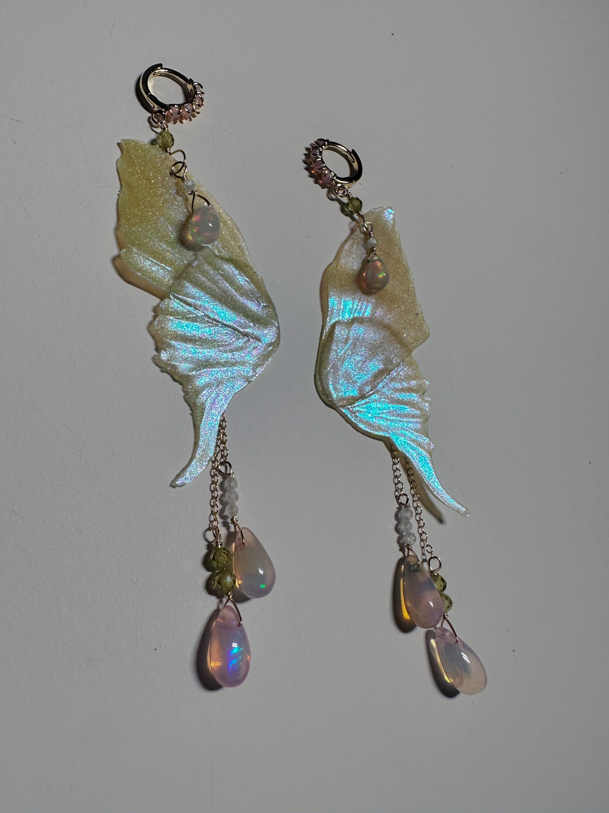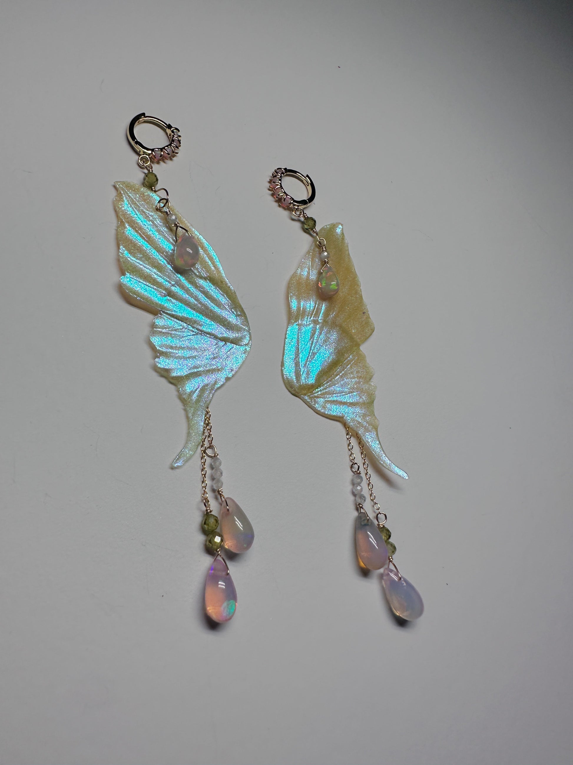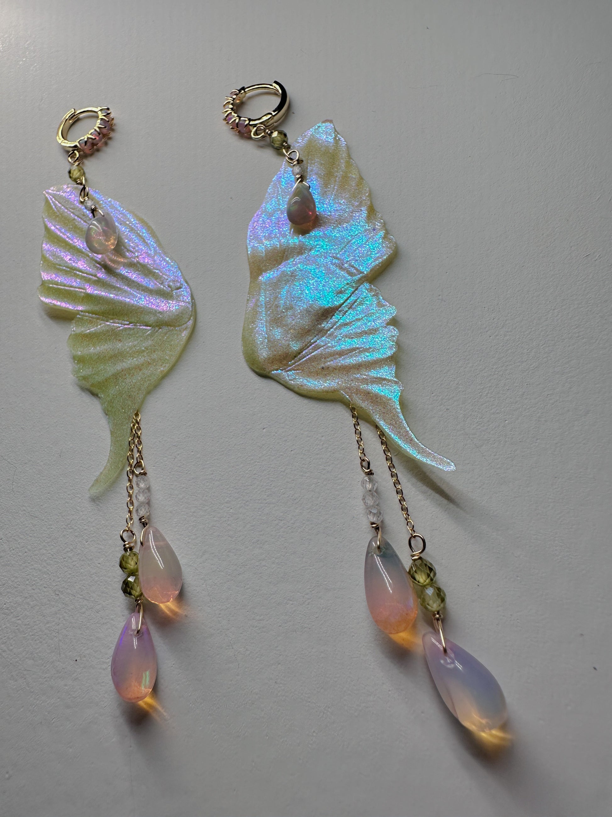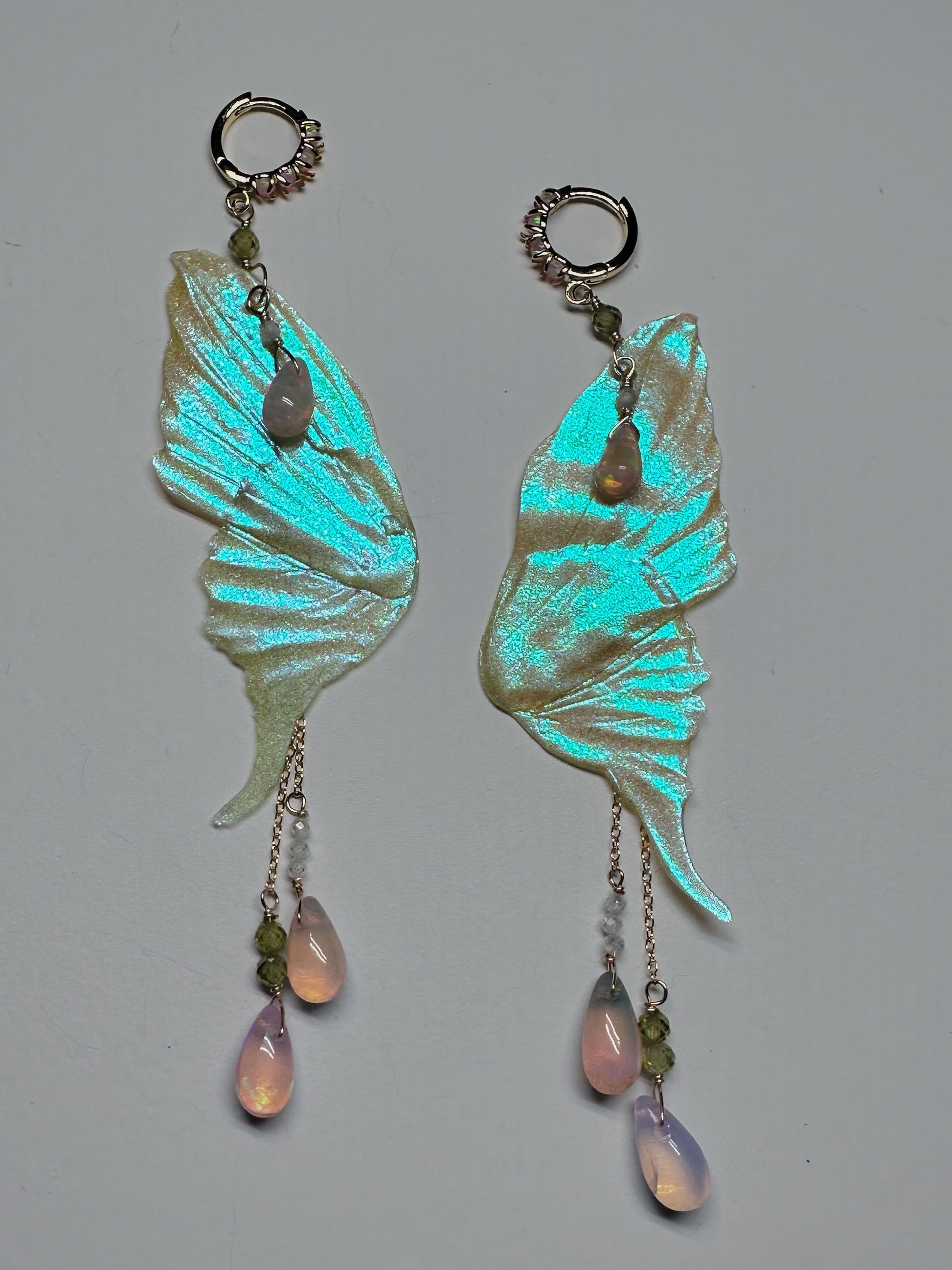 delicate lavender Ethiopian opals dance beneath soft meadow green fairy wings, creating an effortlessly enchanting look perfect for everyday magic on brass pink opal huggies