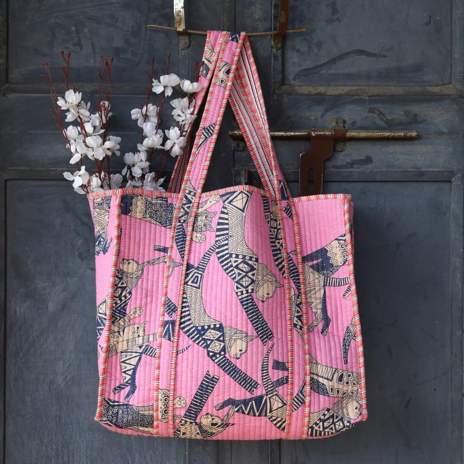 Tropical Cat Cotton Tote Bag – Pink Screen Printed with Quilted Finish