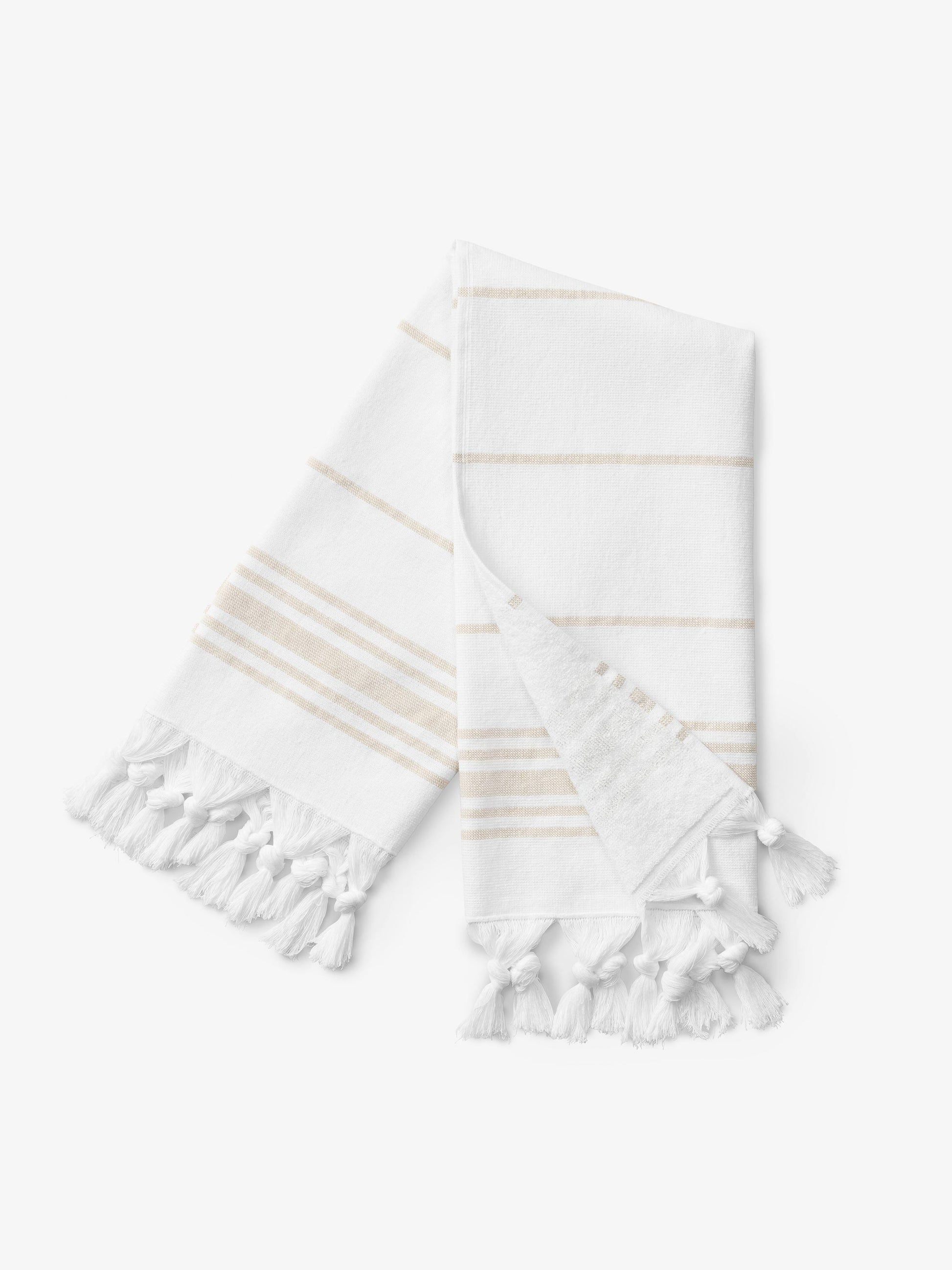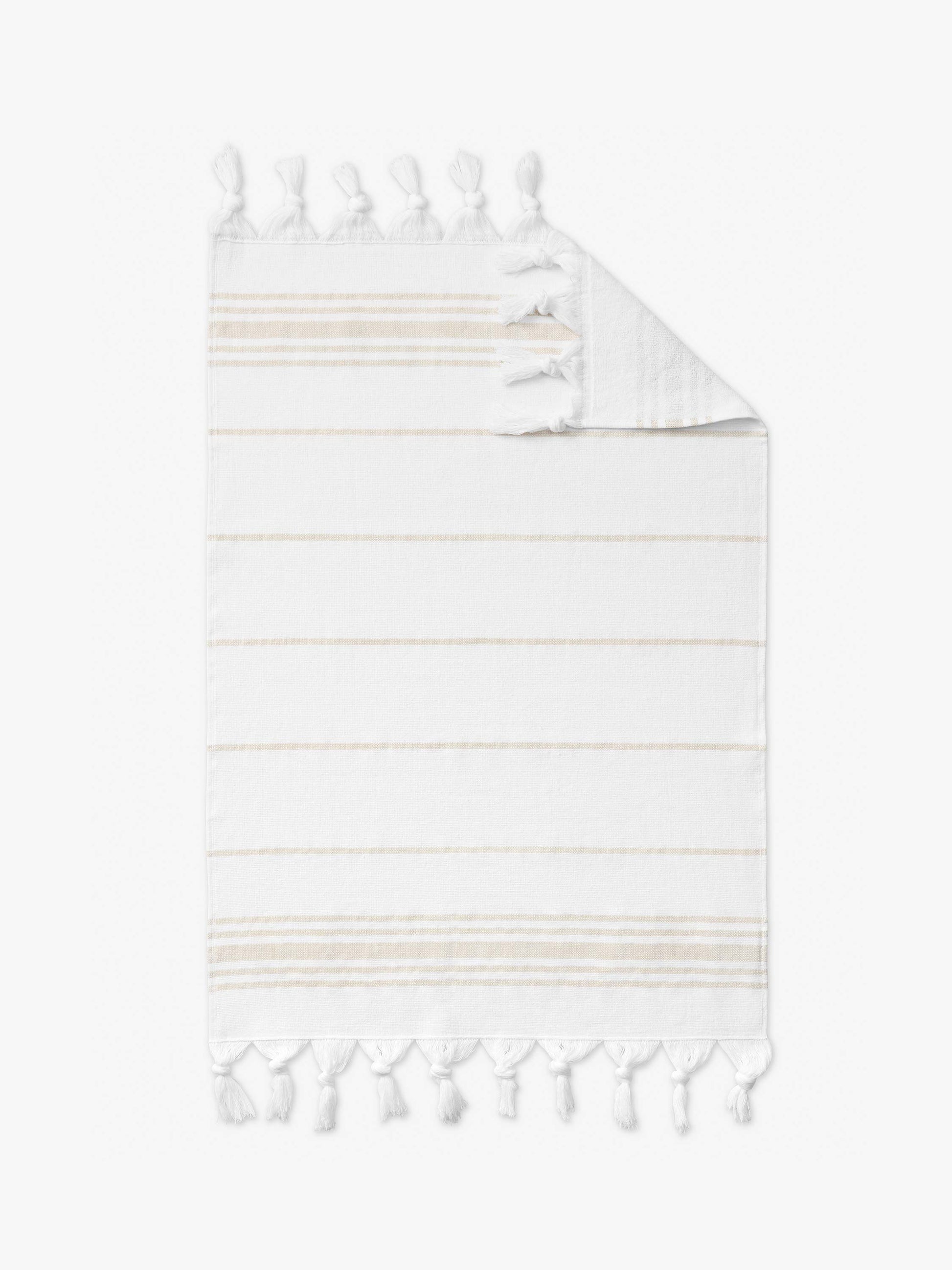 Understated luxury in classic stripes and pleasing hues finished with a playful fringe. The familiar plushness and absorbency of our signature Turkish towel redesigned for your hands. Expertly crafted, long-lasting, and stylish, these towels will add a touch of sophistication to your bathroom and kitchen for countless washes. Also available as a matching bath towel.